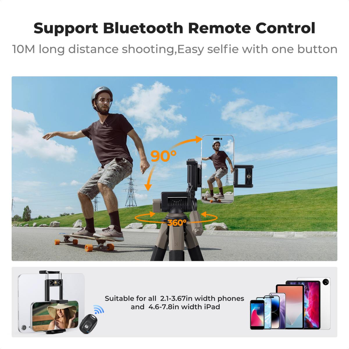 Штатив оснащений компактним Bluetooth-пультом, який дозволяє знімати фото та відео з відстані до 12 метрів — чи то сімейне фото, селфі, відео, пряма трансляція, влог чи інше.
